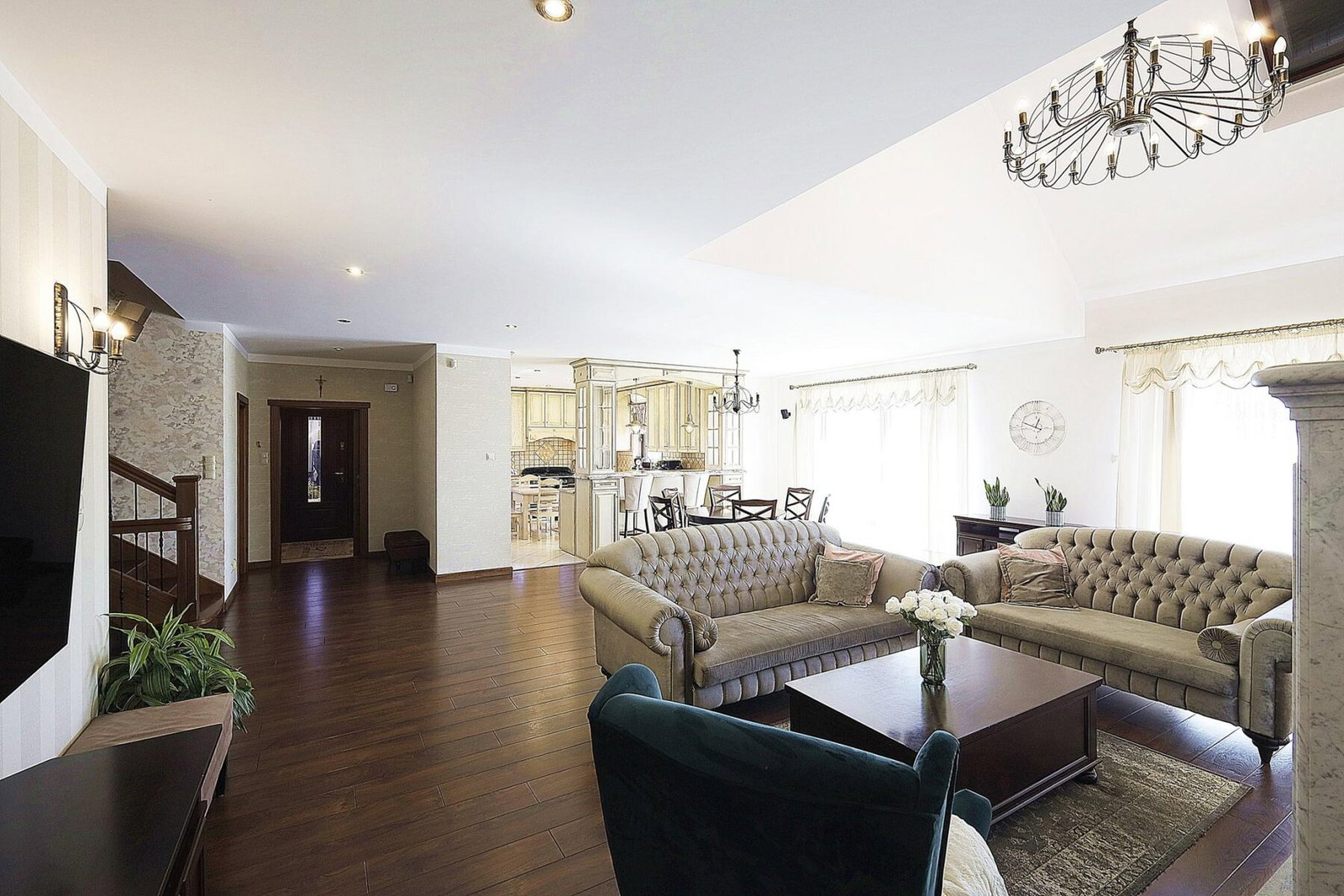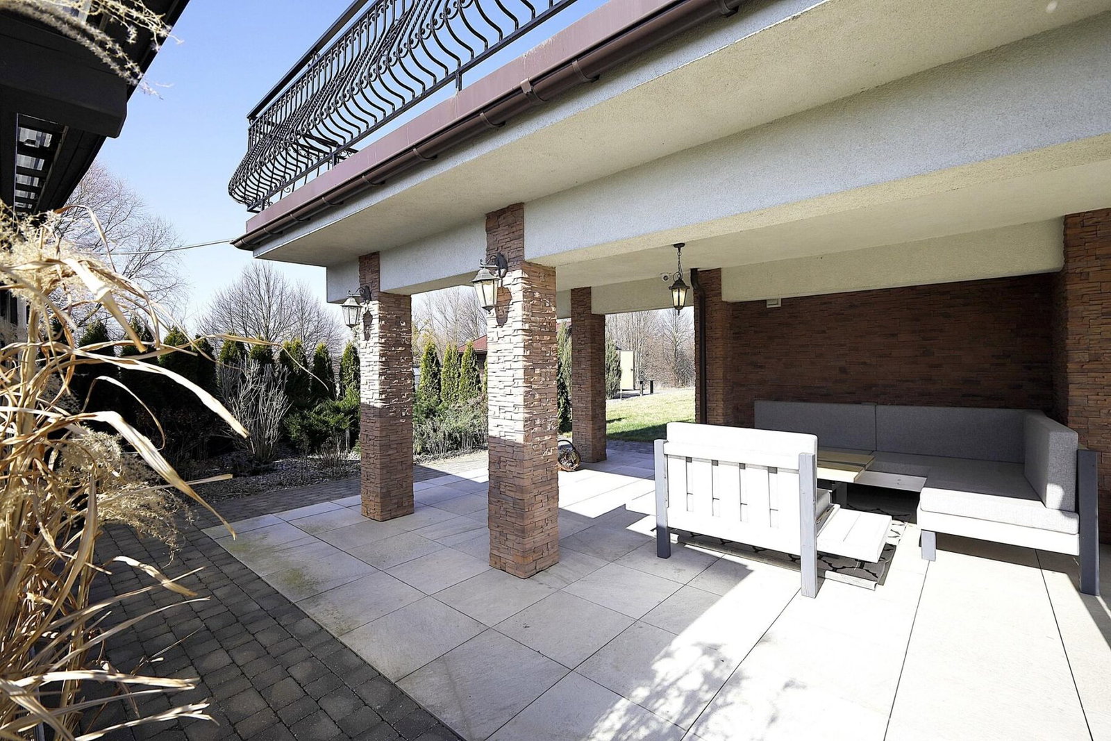 Rezydencja ma 7 pokoi, w tym reprezentacyjny salon z marmurowym kominkiem, przestronną jadalnię oraz główną sypialnię z garderobą i prywatną łazienką. Dodatkowo, w przyziemiu znajduje się strefa rozrywki z barem, sauną i kinem domowym.