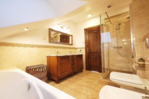 - Luksusowe wykończenie – marmury, kwarcyt, kominki, detale klasy premium