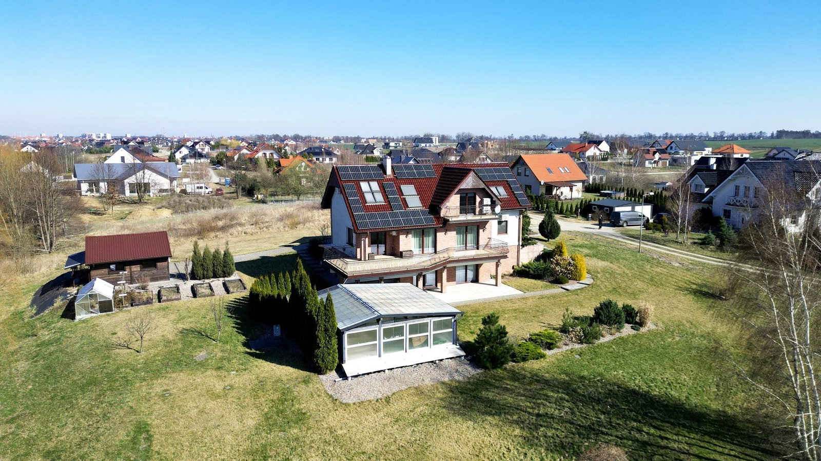 Dom jest w idealnym stanie technicznym, z luksusowym wykończeniem i nowoczesnymi technologiami, takimi jak fotowoltaika i pompa ciepła, co zapewnia komfort i niskie koszty utrzymania.