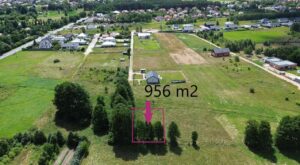 Działka ma powierzchnię 956 m² i jest w kształcie prostokąta. Teren jest płaski, co czyni go idealnym pod budowę domu z ogrodem.
