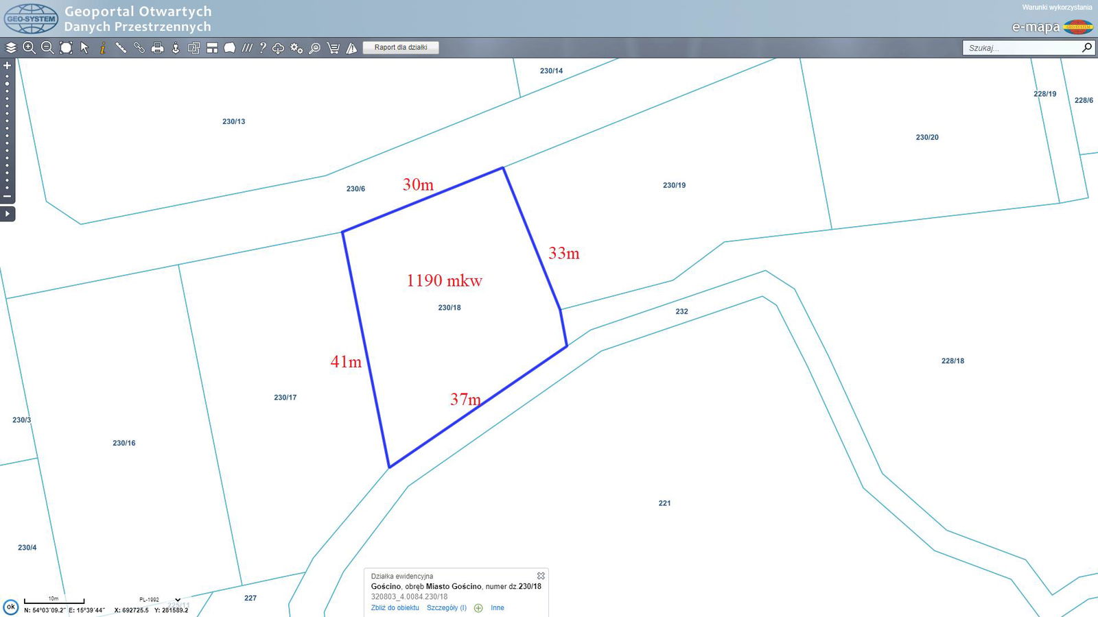 1. Jaka jest powierzchnia i kształt tej działki?