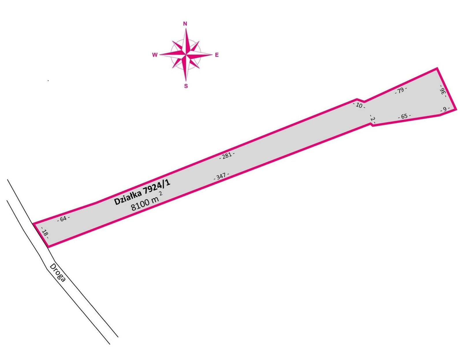 Działka ma powierzchnię 81 ar i kształt prostokąta, który rozszerza się przy granicy od strony północno-wschodniej.