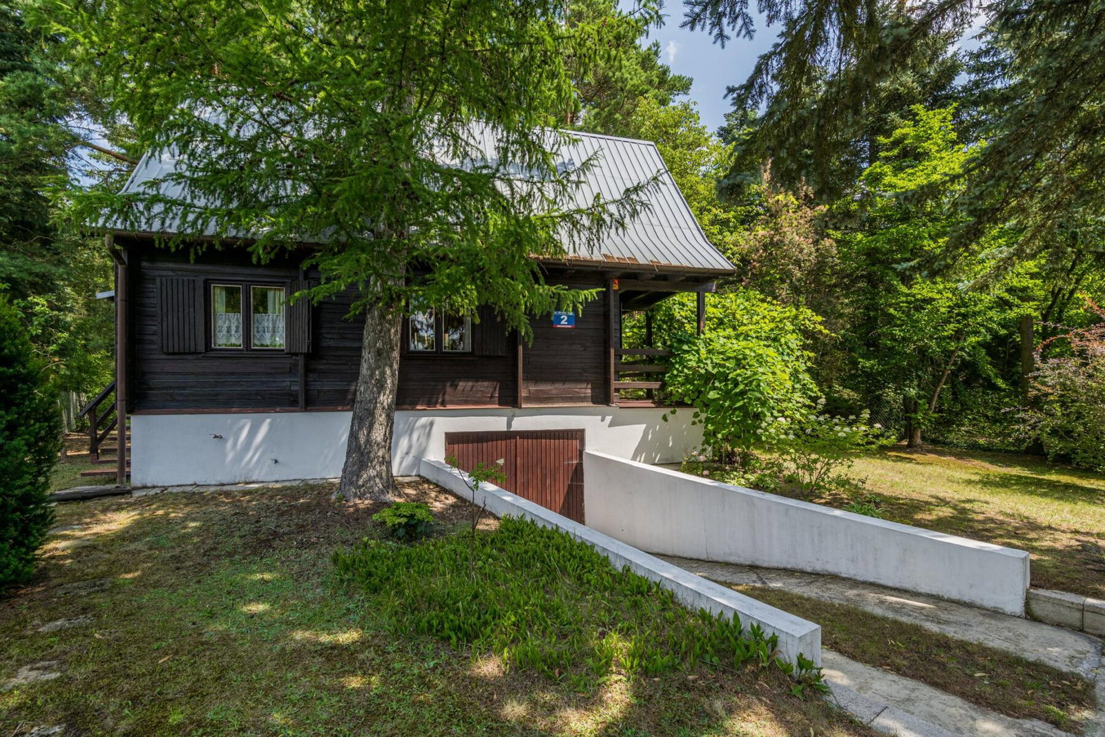 Na działce drewniany 3-pokojowy piętrowy domek typu Mazowsze w bardzo dobrym stanie, o powierzchni użytkowej ok. 100 m2, starannie konserwowany, ze spadzistym dachem, podpiwniczony z obszernym garażem w bryle budynku. Łazienka z oknem, WC i kabiną prysznicową oraz część kuchenna. Na podłodze deski sosnowe, okna tradycyjne - drewniane.