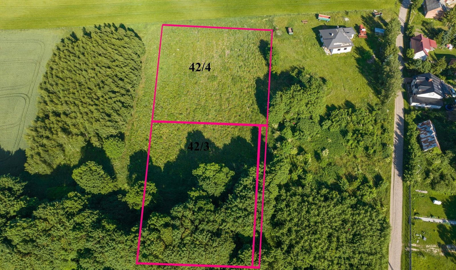 Grunt o powierzchni 3058 m2, numer ewidencyjny 42/3, wymiary ok. 63x50 m. Dojazd z drogi publicznej.
