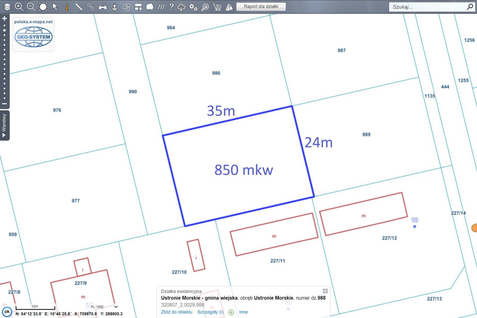 Działka ma powierzchnię 850 m² i jest w kształcie prostokąta. Jej wymiary to 24×35 metrów, co sprawia, że jest dobrze proporcjonalna do planowanej inwestycji.