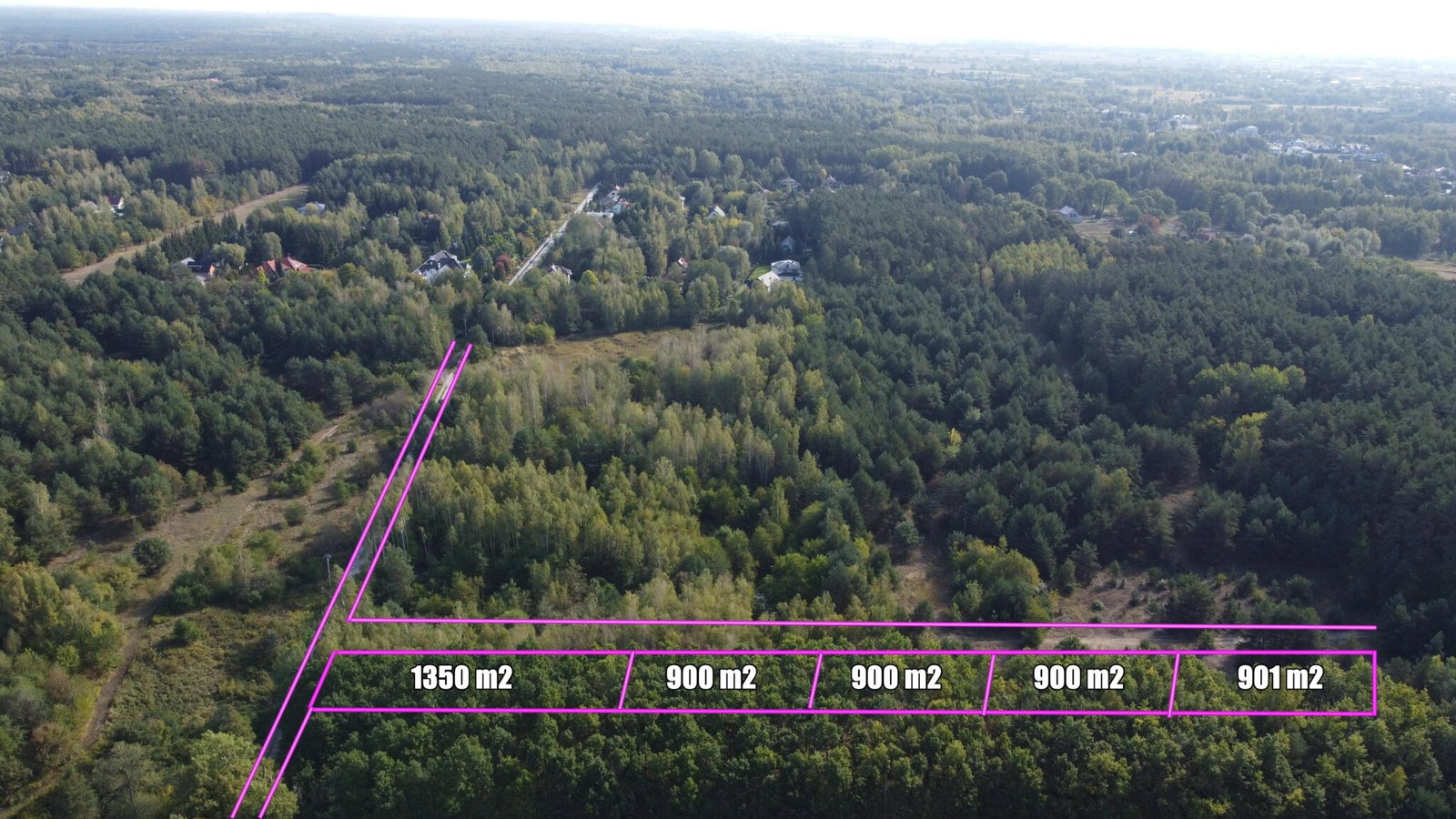 Grunt przeznaczony na sprzedaż podzielony na 5 działek z wyznaczoną drogą wewnętrzną.
