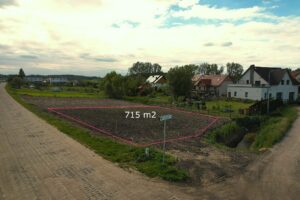 Działka ma powierzchnię 715 m² i jest w kształcie trapezu. To narożna działka o płaskim terenie, co ułatwia planowanie budowy.