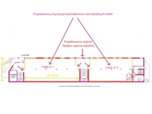 Podział lokali przewiduje dwa niezależne lokale na każdej kondygnacji (parter, piętro, poddasze). Centralna klatka schodowa oraz frontowe wejście od ul. Terebelskiej mogą pełnić funkcję wspólnej komunikacji, a istniejące schody łączące kondygnacje pozostaną w użytkowaniu wspólnym.