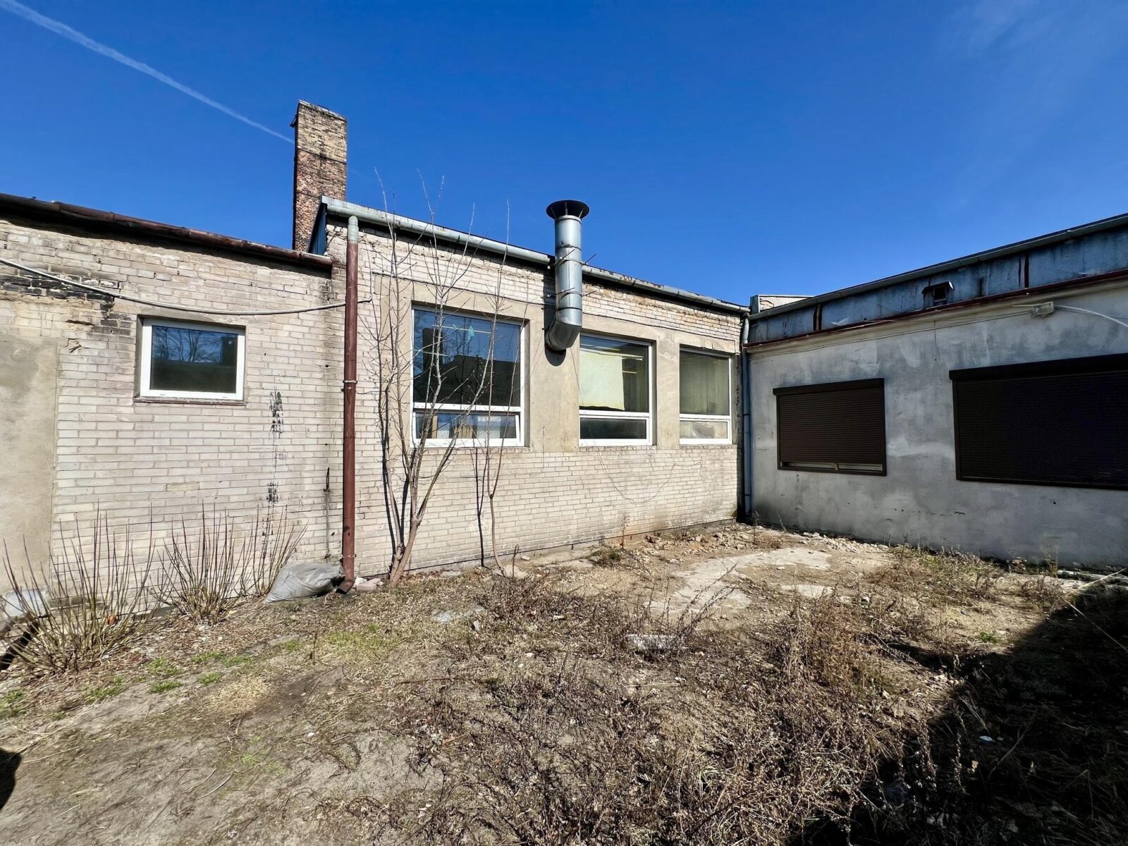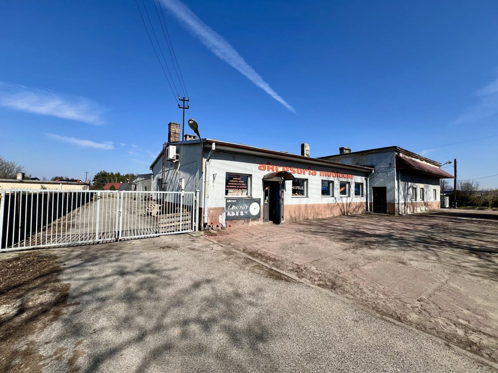 Teren nieruchomości częściowo utwardzony (trylinka, asfalt, beton), ogrodzony płotem betonowym, z dwoma bramami wjazdowymi. Media: prąd, woda z sieci, kanalizacja oraz własna kotłownia na paliwo stałe (CO).