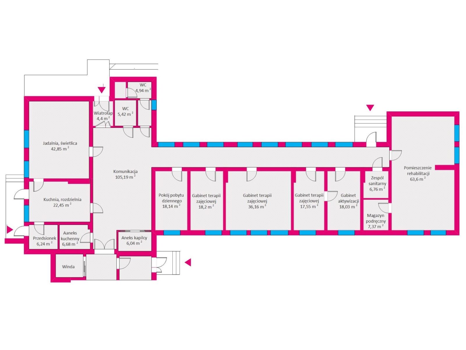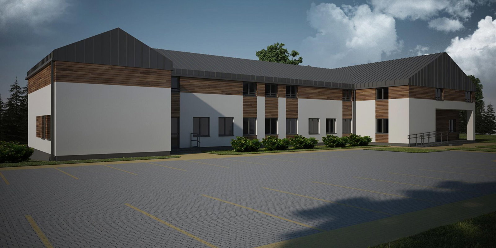 Nieruchomość to dawna szkoła o powierzchni 503m2, która po rozbudowie przekształci się w funkcjonalny obiekt usługowy pomocy społecznej. Budynek składa się z dwóch części: istniejącej, podlegającej przebudowie oraz nowej, dwukondygnacyjnej z poddaszem. Połączone razem tworzą harmonijny i funkcjonalny układ. Istnieje również możliwość przekształcenia obiektu na inne funkcje, takie jak mieszkalna czy inne rodzaje usług.