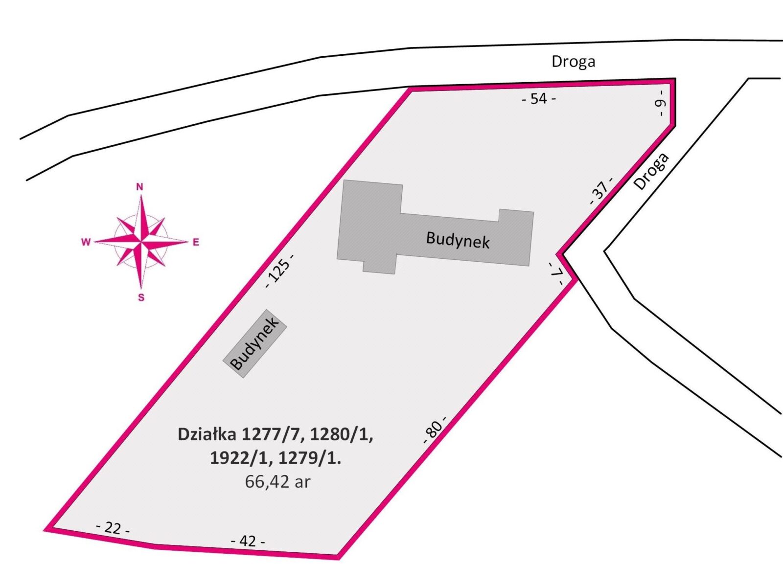 - Położenie na dużej działce 66,42 ar, zapewniającej przestrzeń i potencjał rozwoju.