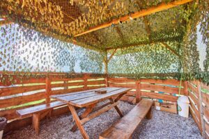 Lokal znajduje się przy głównej drodze oraz przystanku autobusowym, co zapewnia stały ruch pieszych i dobrą widoczność. Przed budynkiem ustawiona jest drewniana pergola, która może służyć jako miejsce ekspozycji lub ogródek sezonowy.
