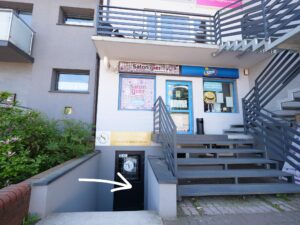 Lokal położony jest na pół piętrze, a wejście do budynku znajduje się na poziomie chodnika od strony głównej ulicy. Szczegóły dotyczące parkingu są dostępne po kontakcie.