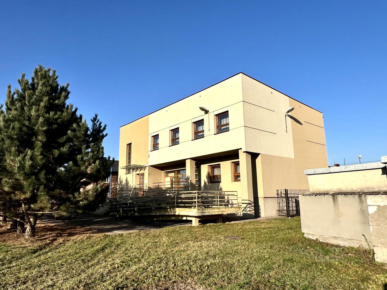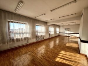 Parter: Duża sala, pomieszczenia biurowe oraz wejście przystosowane dla osób z niepełnosprawnościami.