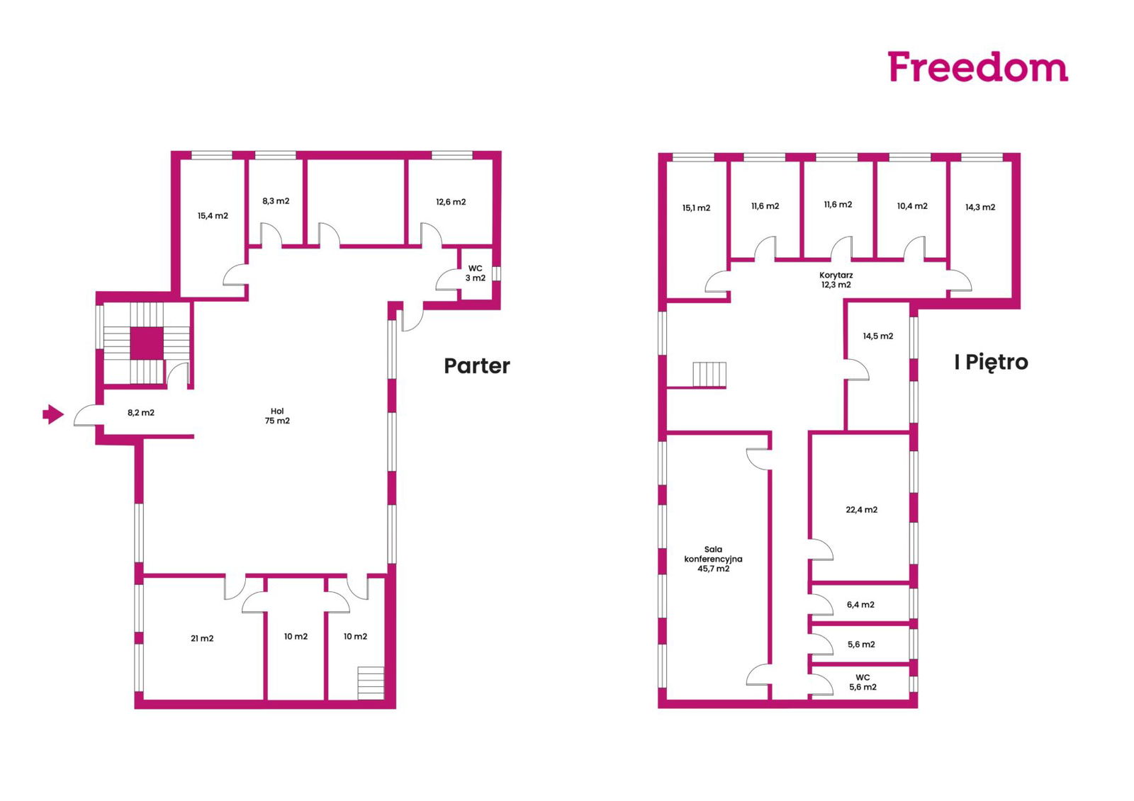 Piętro: Pomieszczenia biurowe, sala konferencyjna, łazienki i toalety.