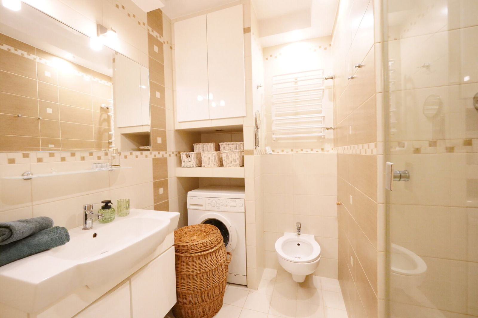 -duża łazienka z prysznicem, umywalką i bidetem,