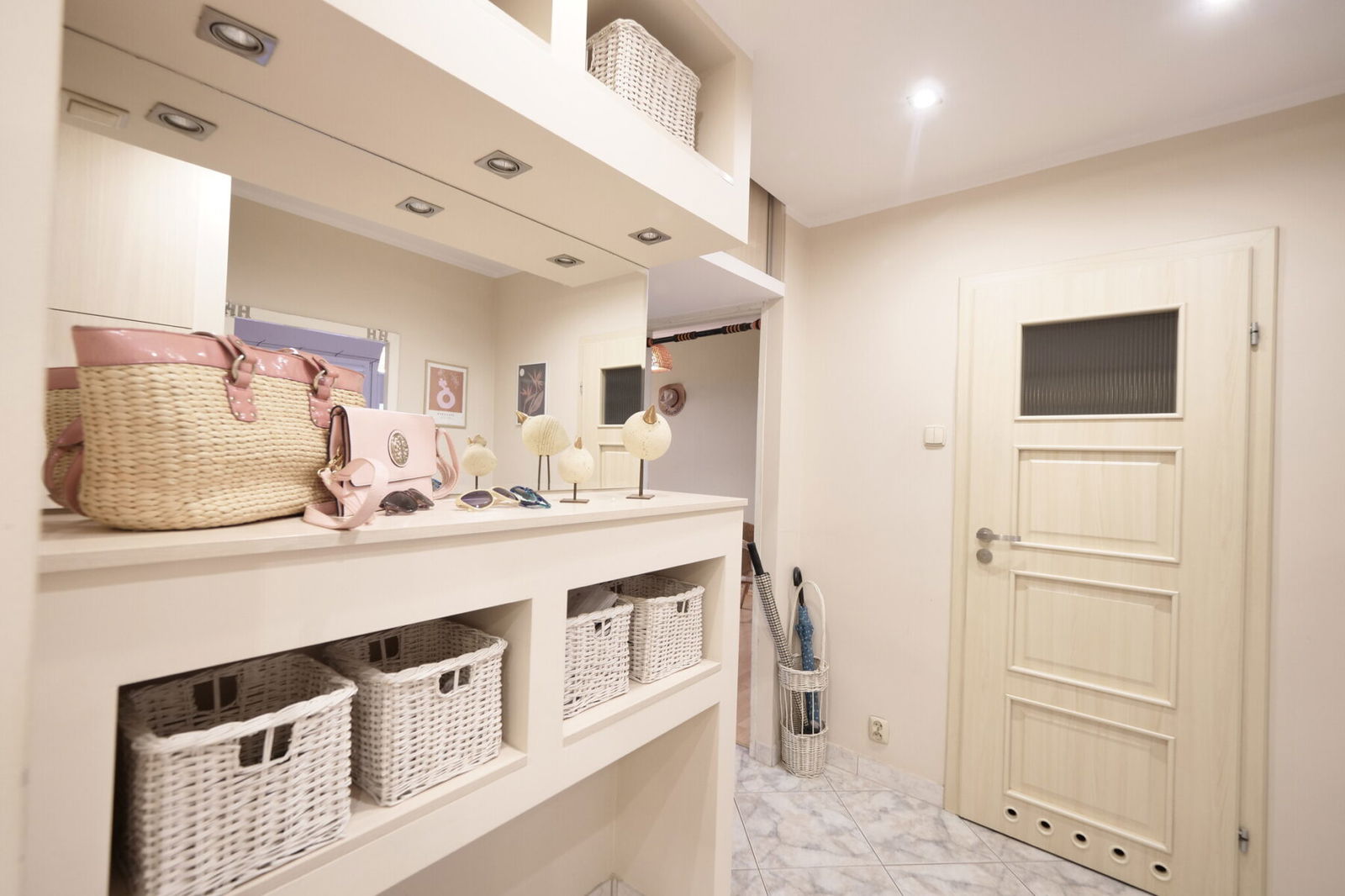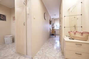Wejście do mieszkania prowadzi przez korytarzyk współdzielony tylko z jednym sympatycznym sąsiadem – do dyspozycji praktyczne szafki na drobiazgi.