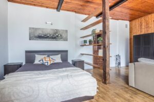 W salonie znajduje się uroczy kominek, który tworzy atmosferę ciepła i przytulności, szczególnie w chłodniejszych miesiącach. Drewniane podłogi w całym mieszkaniu oraz ponadstandardowa wysokość 3 m podkreślają wyjątkowy charakter wnętrza.