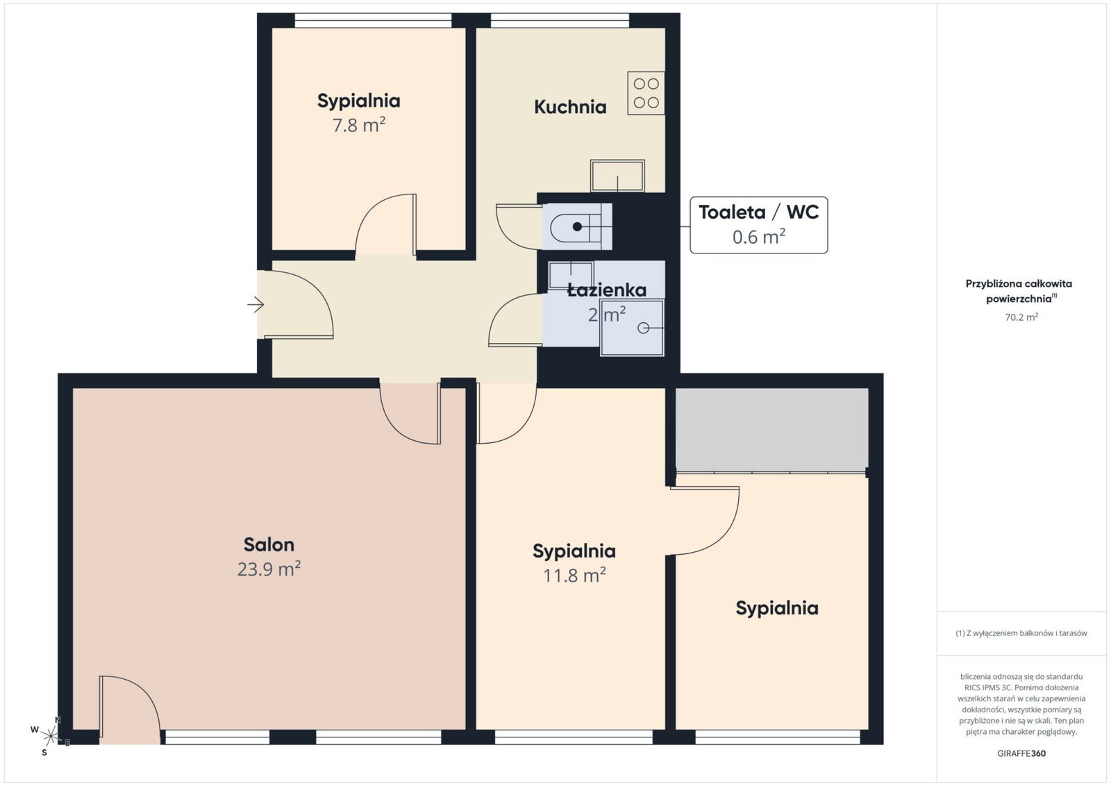 Mieszkanie ma powierzchnię 72,38 m2 i składa się z 4 pokoi, w tym dużego salonu z wyjściem na balkon oraz 3 sypialni.
