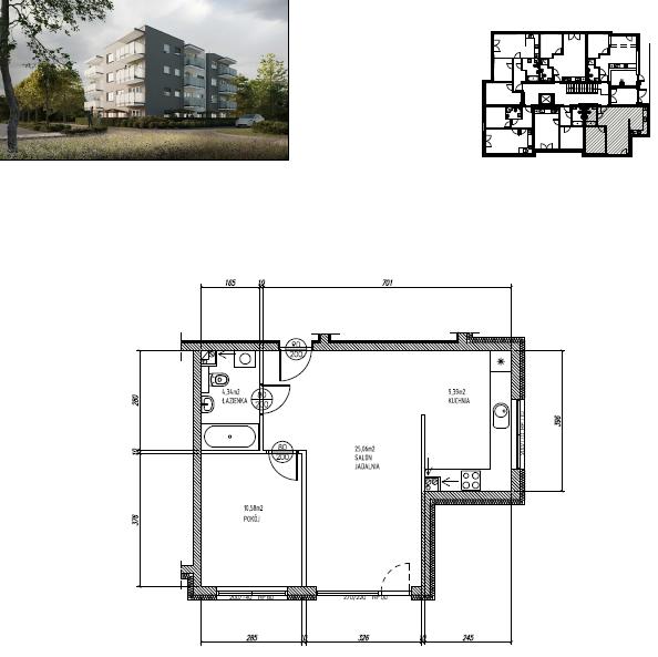 Mieszkanie M.0.1 o powierzchni 49,37m2 usytuowane jest na parterze z wystawą okien na północ i wschód. Składa się z salonu z aneksem kuchennym, łazienki, przedpokoju oraz sypialni. Podsiada wyjście do indywidualnego ogródka o powierzchni 38,67m2.