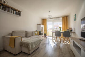 Pokaż więcej Mieszkanie ma powierzchnię 46,71 m² i składa się z dwóch pokoi: słonecznego salonu oraz przytulnej sypialni.