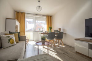 - Salon z wyjściem na balkon: Idealne miejsce na relaks i wypicie porannej kawy.
