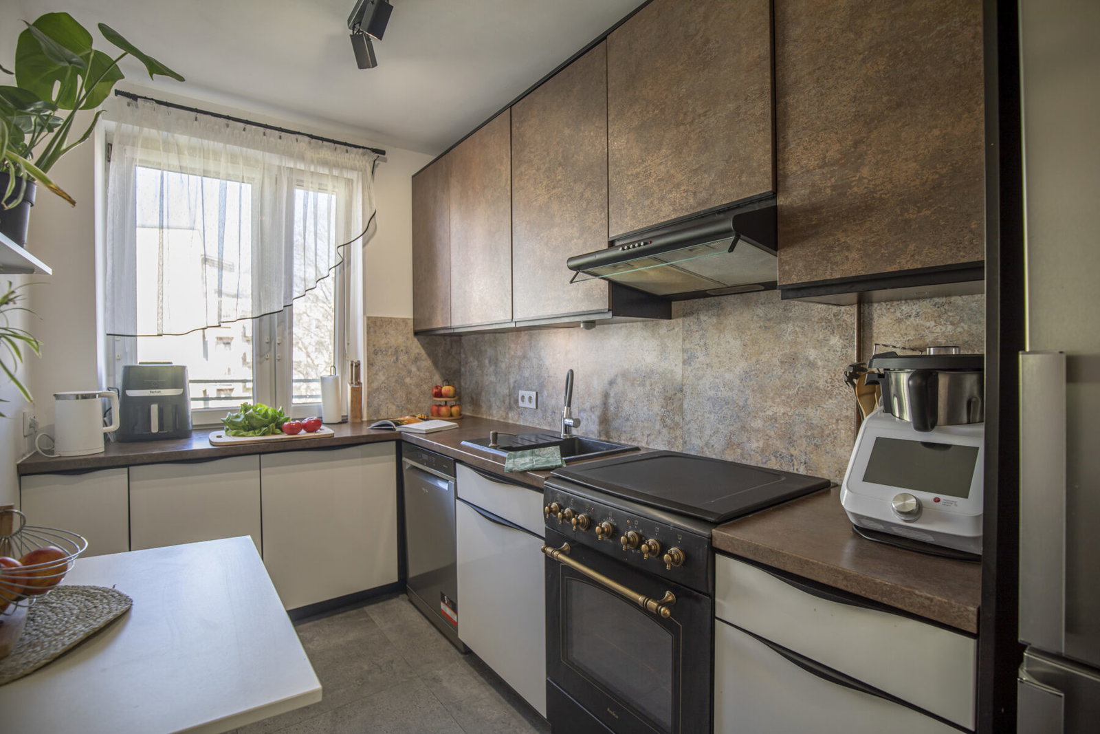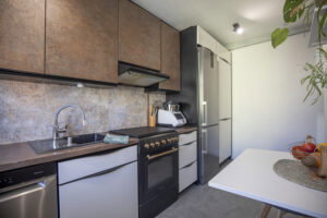 - Kuchnia w zabudowie: W pełni wyposażona, z praktyczną zabudową na pralkę i suszarkę, co maksymalnie wykorzystuje przestrzeń.