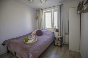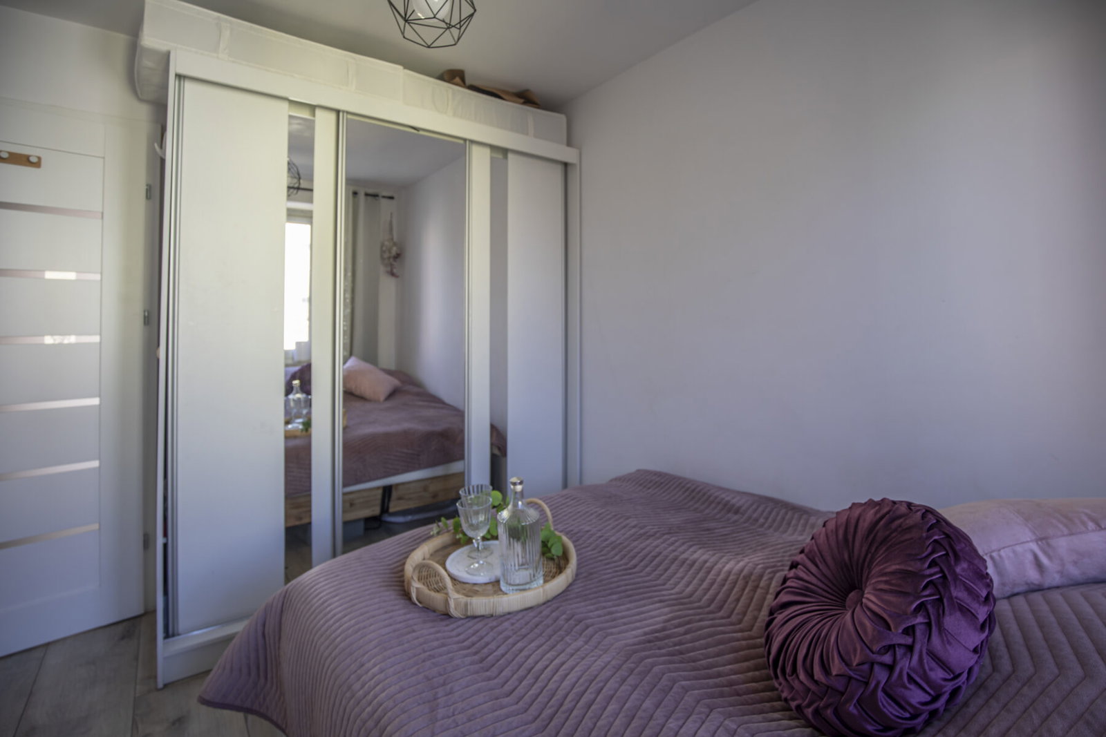 - Sypialnia: Jasna z dużą szafą oraz podwójnym łóżkiem sypialnianym.