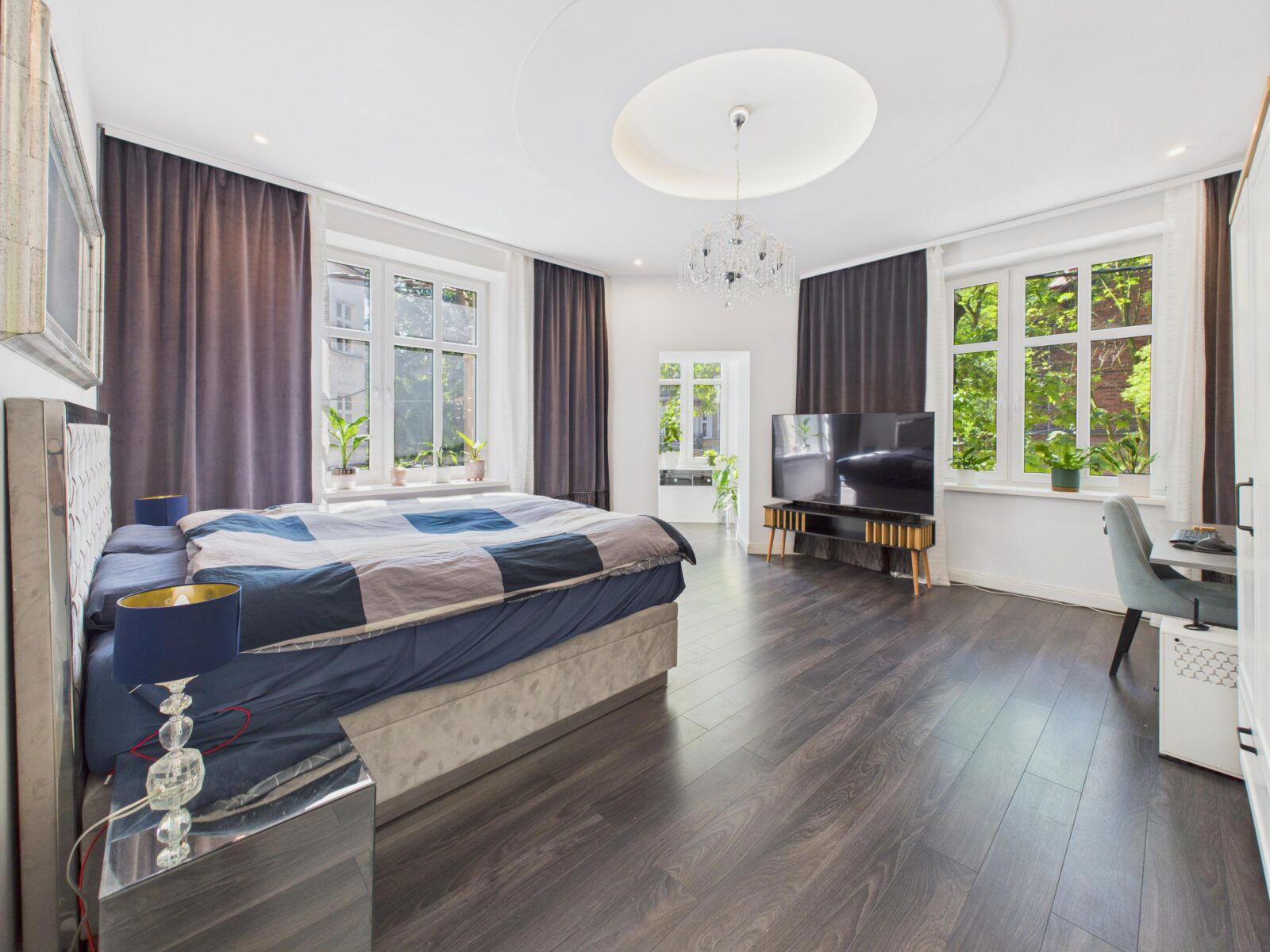 Mieszkanie wyposażone zostało w stylowe meble wykonane na zamówienie: dębowy stół na żelaznych nogach, komplet sześciu tapicerowanych krzeseł oraz eleganckie szklane żyrandole-antyki (jeden sprowadzony z Holandii, dwa z Czech/Polski). W sypialni znajduje się kontynentalne łóżko ze schowkiem, a także lustrzane meble Kare Design: komoda i szafki nocne. Całość dopełniają zasłony szyte na wymiar marek Pierre Cardin i Eva Minge.