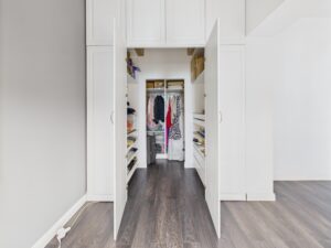 W jednym z pokoi znajduje się powiększona garderoba, wykończona zabudową na wymiar.