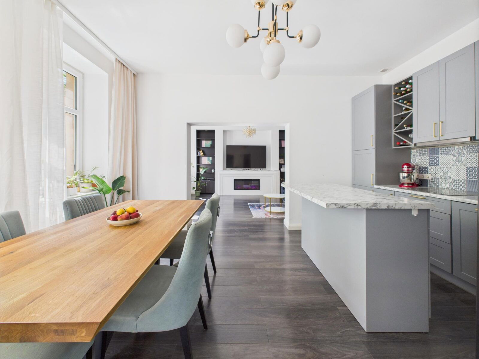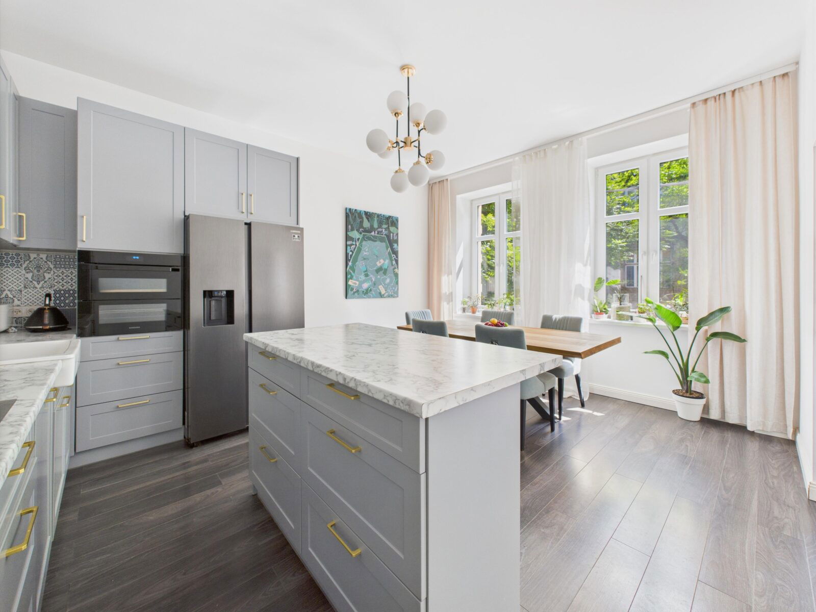 Kuchnia została wykonana na wymiar i wyposażona w zmywarkę Bosch, piekarnik dual cook marki Samsung oraz dwudrzwiową lodówkę Samsung z kostkarką i filtrowaną wodą.