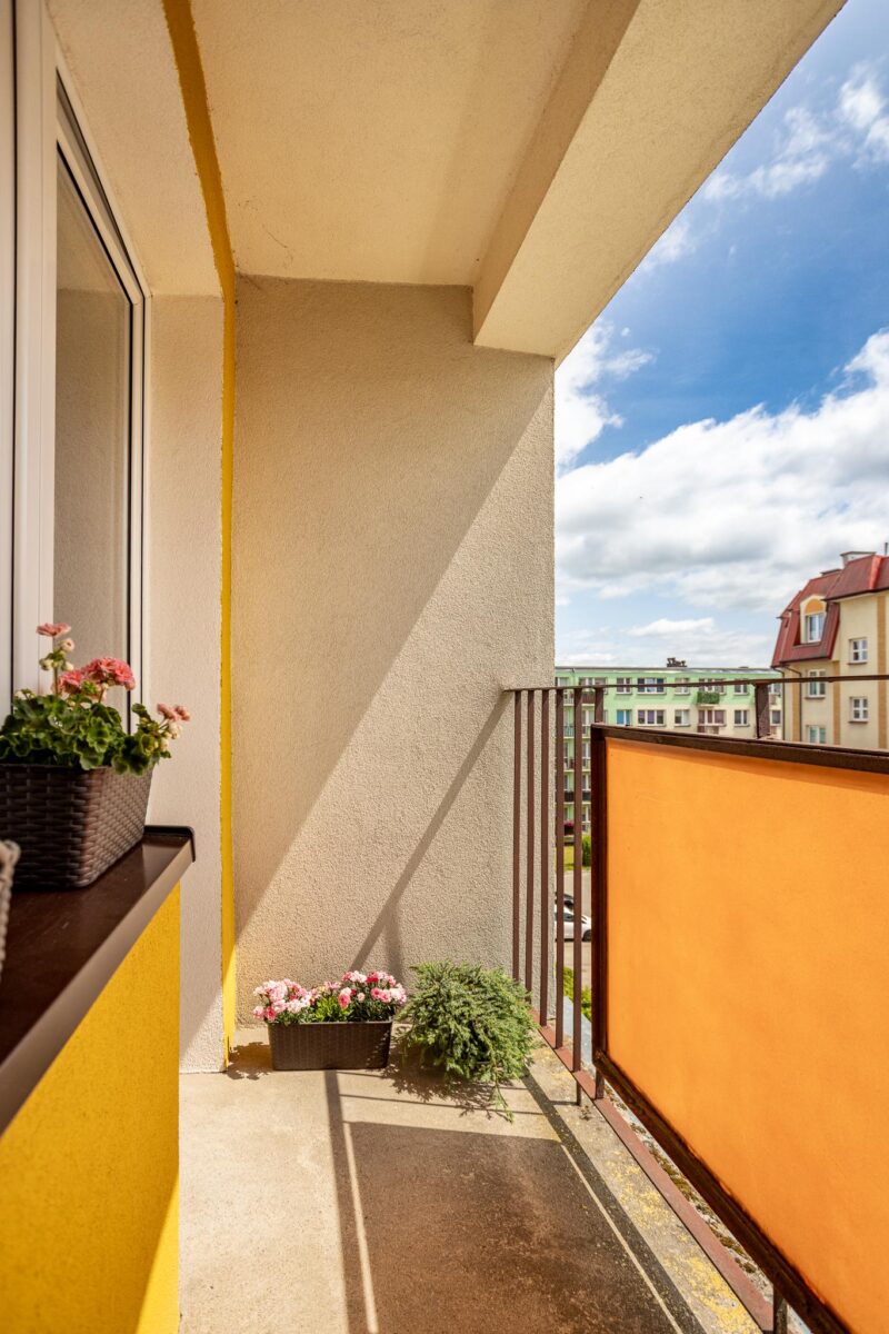 Mieszkanie składa się z dwóch pokoi, kuchni, łazienki z WC oraz przedpokoju. Z dużego pokoju można wyjść na balkon, co jest dodatkowym atutem.