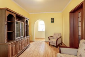 Mieszkanie jest częściowo umeblowane i może wymagać remontu lub odświeżenia, w zależności od indywidualnych potrzeb. Na podłogach w łazience i kuchni znajduje się terakota, a w pozostałych pomieszczeniach panele. Okna są z PCV.