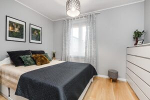 Drugi pokój zagospodarowany jako sypialnia. Z sypialni jest wejście do bardzo dużej garderoby, mogącej służyć jako dodatkowe pomieszczenie do pracy.