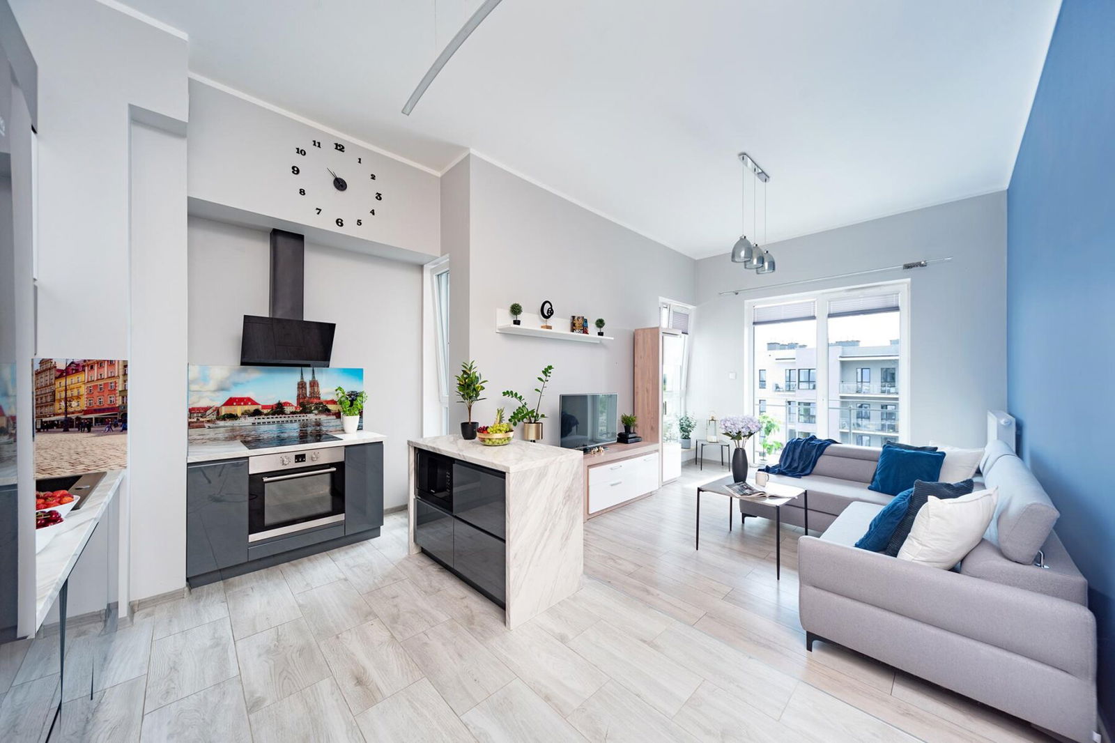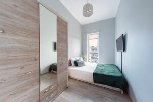 Usytuowane na 17 piętrze 17-sto piętrowego budynku z 2019r. mieszkanie składa się z przestronnego salonu z aneksem kuchennym oraz balkonem, 2 mniejszych, przytulnych pokoi, dużego przedpokoju oraz łazienki. Wysokość pomieszczeń -3,4m sprawia, że mieszkanie wydaje się być większe oraz bardzo przestronne.
