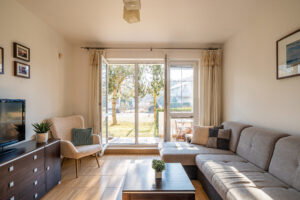 Mieszkanie znajduje się zaledwie 600 m od morza, w malowniczej okolicy sprzyjającej spacerom i przejażdżkom rowerowym. W pobliżu znajdują się tereny zielone oraz infrastruktura rekreacyjna, w tym plac zabaw i kort tenisowy.