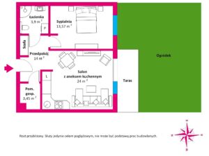 Mieszkanie ma powierzchnię 50,26 m2 i składa się z dwóch pokoi: pokoju dziennego z aneksem kuchennym oraz sypialni. Dodatkowo znajduje się w nim przestronna łazienka, pomieszczenie gospodarcze oraz przedpokój.