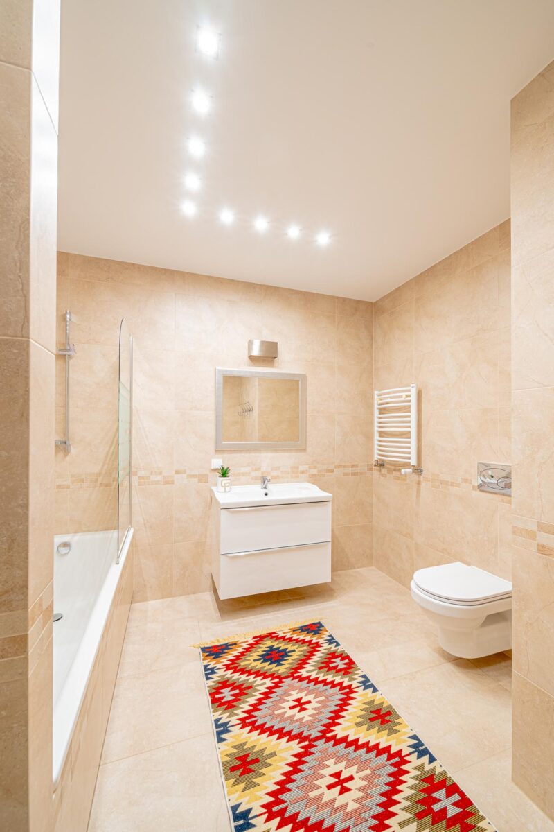 - duża łazienka z wc: o pow. 7,00 m2, z szafą w zabudowie ( możliwość wykonania prysznica) armatura: wanna, miska ustępowa, umywalka,