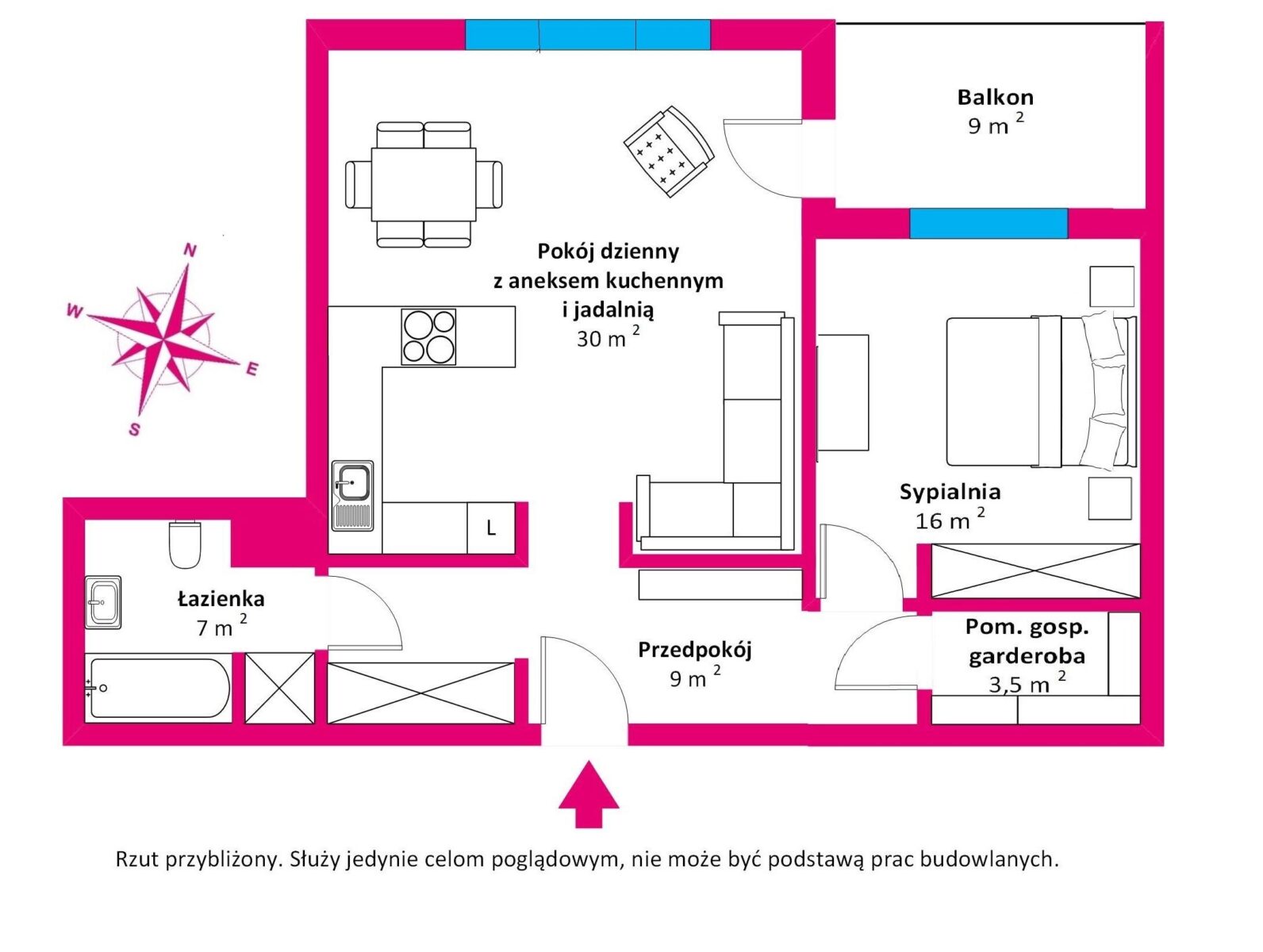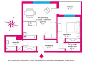 Apartament ma 2 pokoje: przestronny salon z jadalnią i aneksem kuchennym o powierzchni 30 m² oraz przytulną sypialnię o powierzchni 16 m². Dodatkowo, w mieszkaniu znajduje się duża łazienka, funkcjonalny przedpokój oraz praktyczna garderoba.