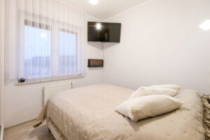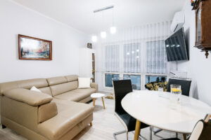 Centralny punkt mieszkania stanowi jasny i słoneczny salon z aneksem kuchennym o powierzchni 20,36 m2. Z salonu mamy wyjście na balkon o powierzchni 4,8 m2. Na wprost od wejścia znajduje się ustawna sypialnia o powierzchni 8,9 m2, a po prawej stronie wejście do łazienki o powierzchni 3,86 m2. Mieszkanie jest wykończone i częściowo umeblowane. W kuchni mamy meble w zabudowie wyposażone w płytę indukcyjną, piekarnik, mikrofalówkę, zmywarkę oraz okap. W sypialni i na przedpokoju znajdują się duże i pojemne szafy do przechowywania. Do mieszkania przynależy piwnica o powierzchni 5,68 m2.