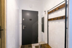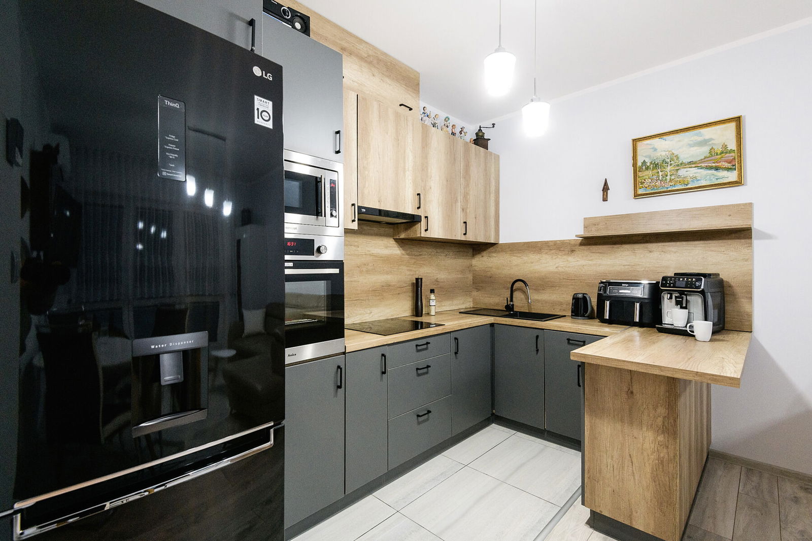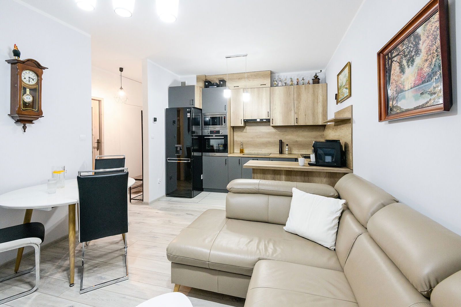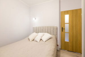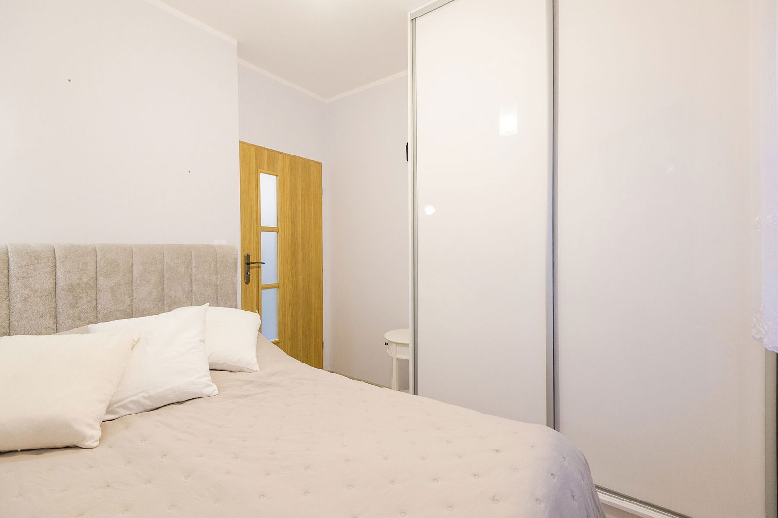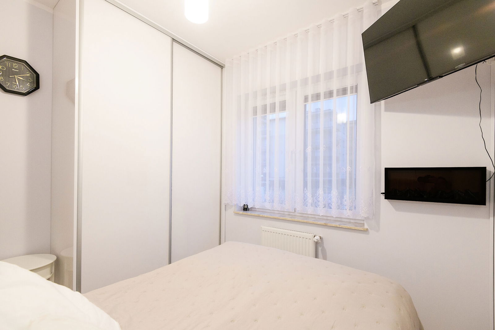 Mieszkanie jest w idealnym stanie, wykończone i częściowo umeblowane. W kuchni znajdują się meble w zabudowie oraz sprzęt AGD, a w sypialni i przedpokoju są duże szafy do przechowywania.