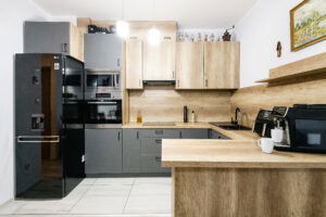 - Podłogi w pomieszczeniach: Panele, Płytki