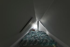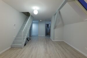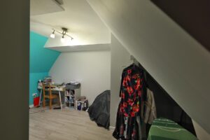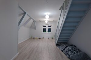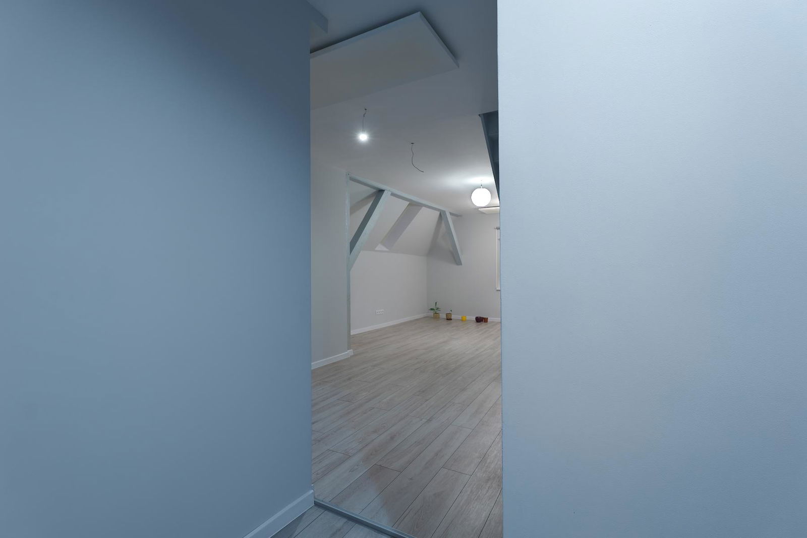 Mieszkanie jest dwupoziomowe i składa się z trzech pokoi. Na pierwszym poziomie znajduje się salon o powierzchni około 27 m², sypialnia o powierzchni około 12 m² oraz kuchnia o powierzchni około 9 m². Na drugim poziomie znajduje się poddasze użytkowe o powierzchni około 20 m². Dodatkowo, mieszkanie posiada przedpokój o powierzchni około 5 m² i łazienkę o powierzchni około 3,7 m².