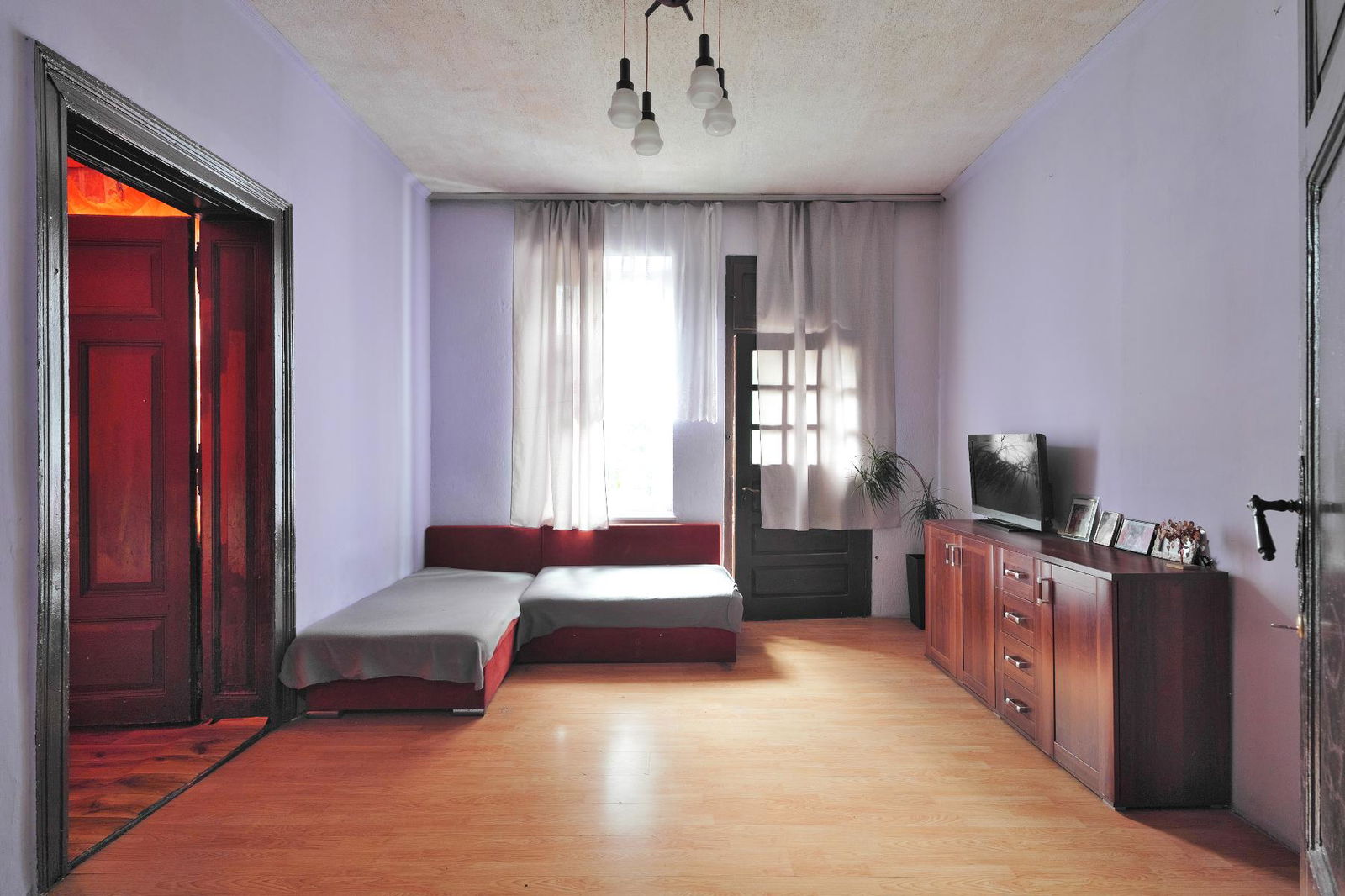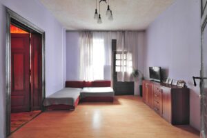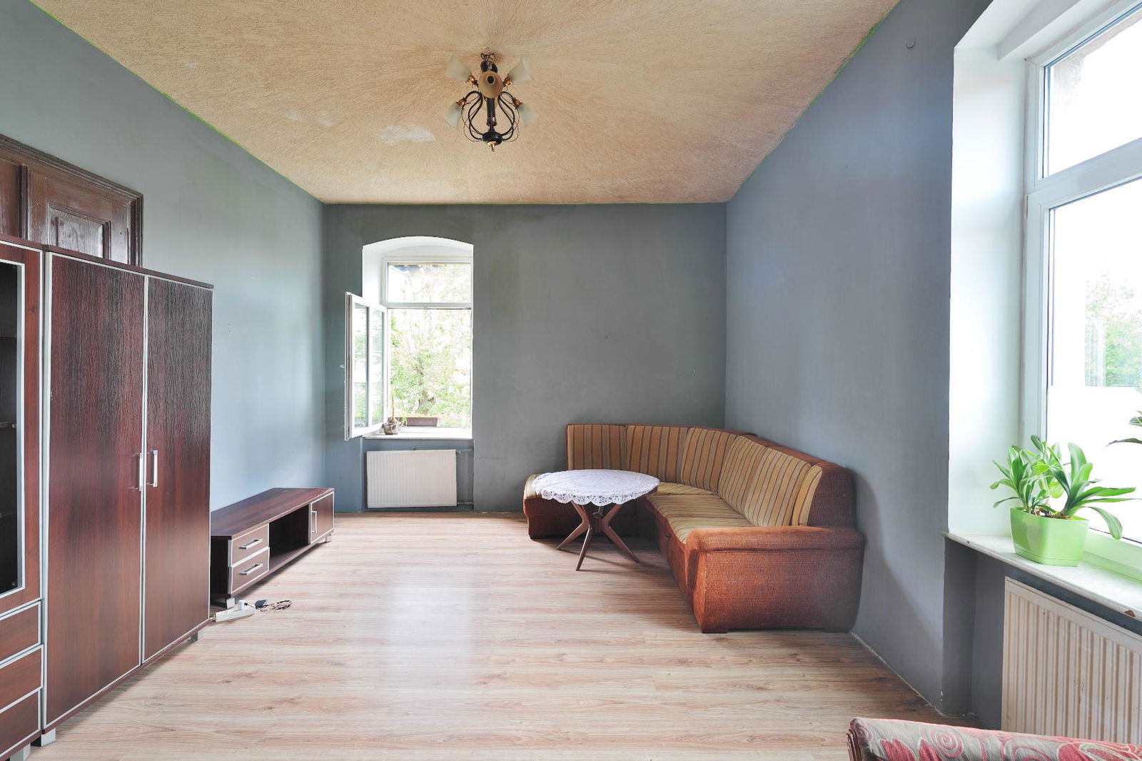 Mieszkanie wymaga kapitalnego remontu. Ogrzewanie jest realizowane za pomocą pieca centralnego na węgiel, a ciepła woda pochodzi z bojlera elektrycznego. Wysokie sufity (300 cm) dają możliwość dowolnej aranżacji wnętrza. Mieszkanie jest częściowo umeblowane.