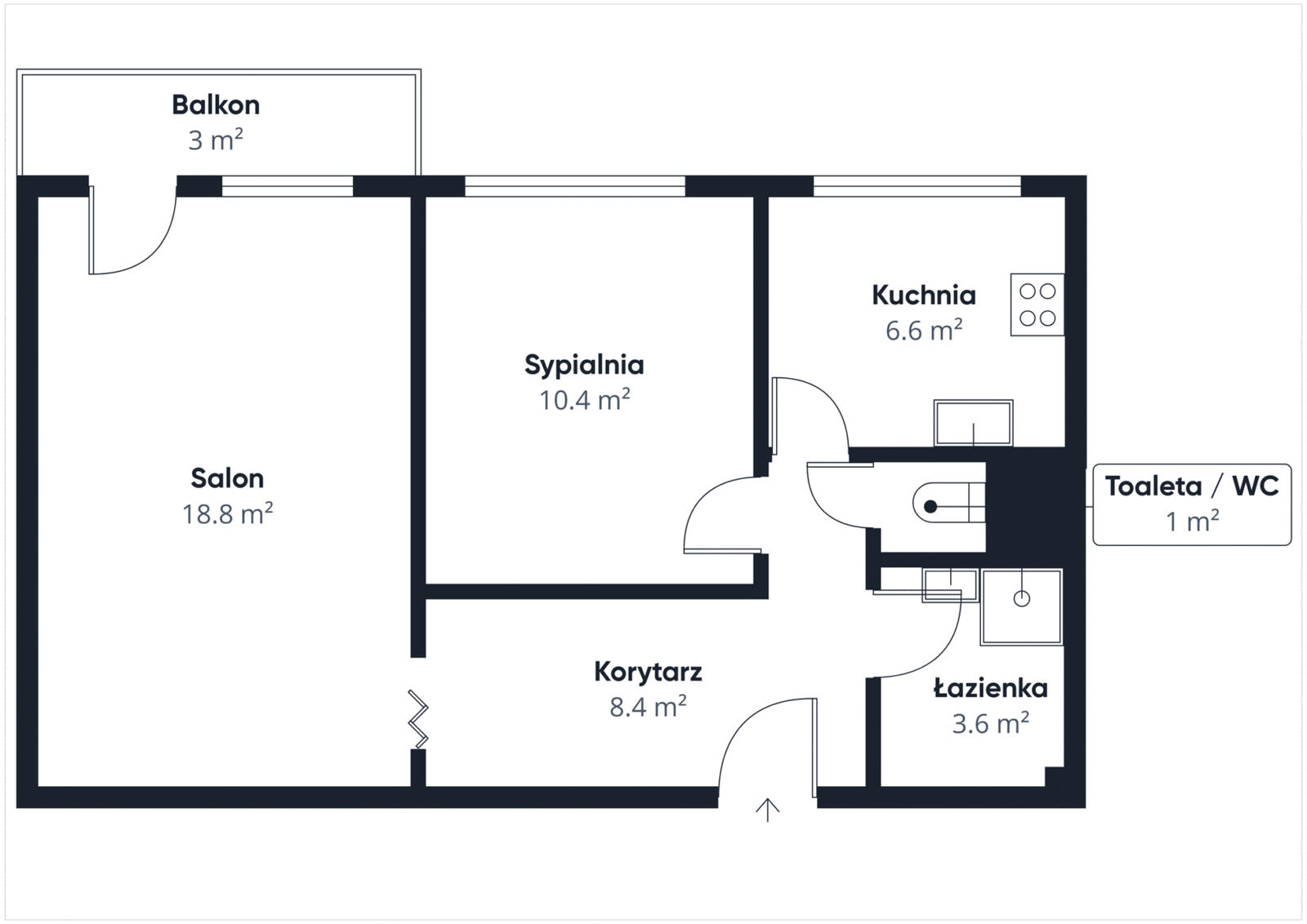 Mieszkanie ma powierzchnię 48,8 m² i składa się z 2 niezależnych pokoi, oddzielnej kuchni, łazienki, osobnej toalety oraz przedpokoju.