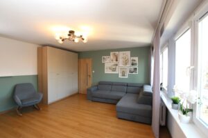 Wnętrze mieszkania jest widne i ustawne. Salon oferuje dużą swobodę aranżacyjną i naturalnie doświetla strefę dzienną. Sypialnia stanowi spokojną, prywatną przestrzeń do odpoczynku. Kuchnia i łazienka są funkcjonalne, a częściowe umeblowanie pozwala na szybkie zamieszkanie lub wygodny start z własną aranżacją.