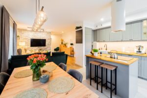 Mieszkanie składa się z przestronnego salonu z aneksem kuchennym, który stanowi idealne miejsce do spędzania czasu z rodziną i przyjaciółmi; dwóch pokoi oraz stylowej łazienki. Dodatkowo, posiada również garderobę, które pozwala na przechowywanie niezbędnych rzeczy.