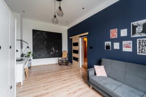 - czterech dużych, przestronnych pokoi o powierzchni 23, 25, 25 i 19 mkw. Każdy z pokoi posiada wysokość 3,8 m