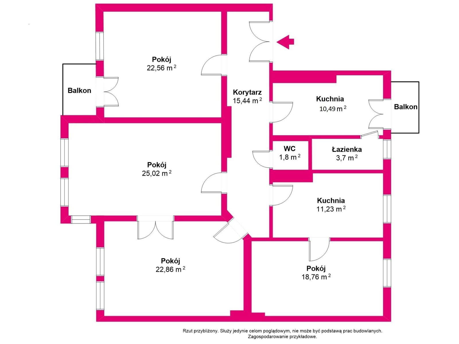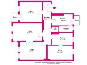 Mieszkanie składa się z czterech dużych, przestronnych pokoi o powierzchni 23, 25, 25 i 19 m². Dodatkowo, są dwie kuchnie, które można zaadaptować na dodatkowy pokój, łazienka oraz osobna toaleta z prysznicem.