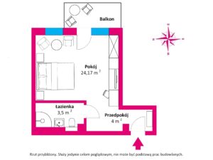 przestronny pokój/sypialnia o pow. 24,17 m2 z wyjściem na balkon o pow. 3,50 m2. Łazienka o pow. 3,50 m2. Przedpokój o pow. 4,00 m2